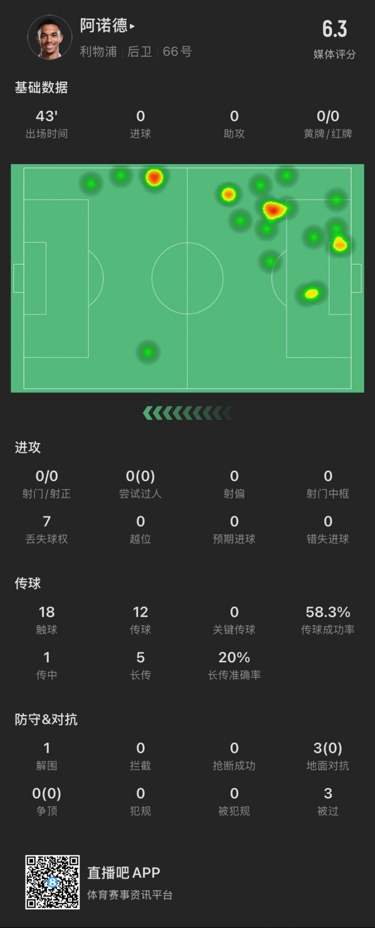 3月6日訊 歐冠1/8決賽首回合焦點戰,巴黎主場對陣利物浦。半場戰罷,兩隊暫時0-0平。上半場,阿諾德多次被過,多項關鍵數據掛零,評分6.3全場第二低。阿諾德半場主要數據↓觸球:18丟失球權:7傳球: