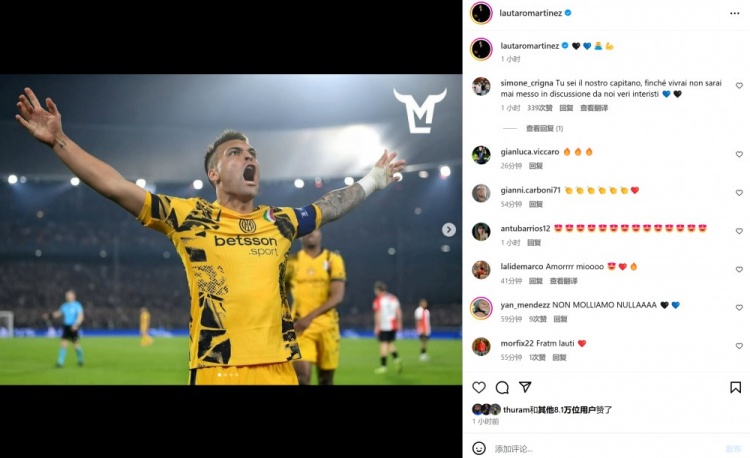 3月6日訊 在本輪歐冠,國米客場2-0擊敗費耶諾德。本場比賽勞塔羅與小圖拉姆雙雙破門,賽后兩人也分別在個人社媒曬出本場進球后怒吼慶祝的照片。