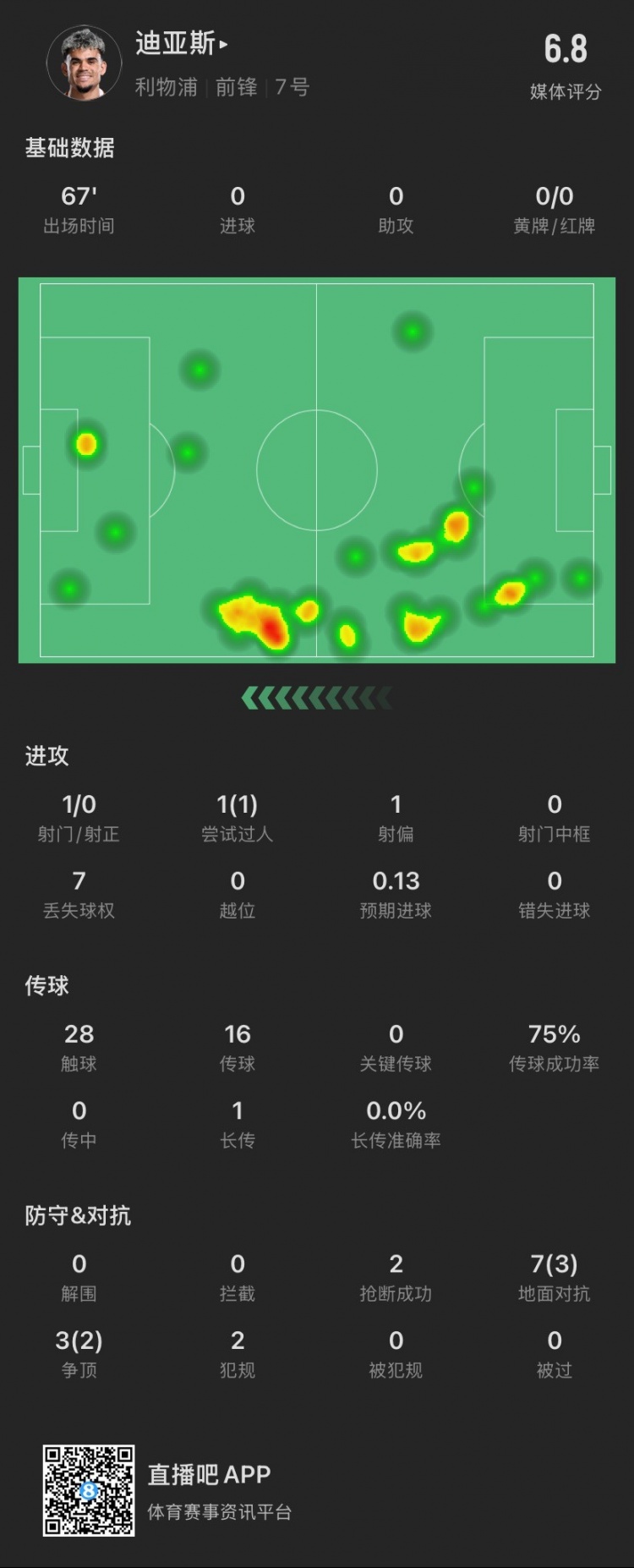 迪亞斯本場:1射門0射正,貢獻2搶斷,10次對抗成功5次,犯規2次