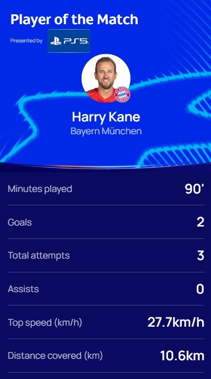 3月6日訊 在本輪歐冠,拜仁3-0擊敗勒沃庫森。本場比賽凱恩梅開二度,3次射門,跑動距離10.6km,賽后他也當選歐冠官方評選的本場最佳球員。