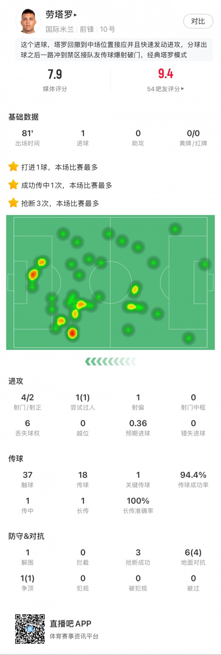 3月6日訊 歐冠1/8決賽首回合,國米客場2-0費耶諾德,勞塔羅本場數據:1粒進球4次射門2次射正1次過人成功1次37次觸球18次傳球成功17次1次關鍵傳球1次傳中成功1次1次長傳成功1次6次地面對抗