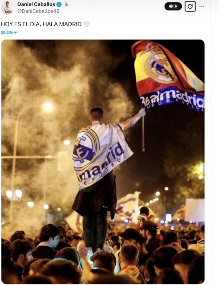 3月4日訊 北京時間3月5日4:00,歐冠1/8決賽首回合焦點戰,皇馬vs馬競將在皇馬主場打響?;蜀R中場塞巴略斯更新社媒,曬出了一張身披皇馬隊旗的海報,并配文寫道:“就在今天,加油皇馬!”
