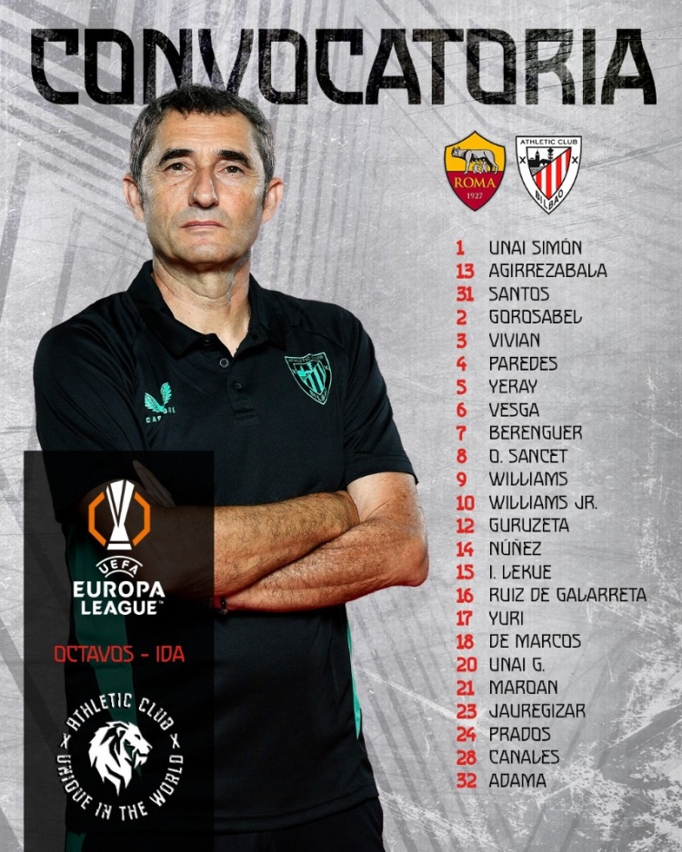 3月4日訊 北京時間3月7日凌晨4:00,歐聯杯1/8決賽首回合,畢爾巴鄂競技將客戰羅馬。賽前,畢爾巴鄂競技官方公布了本場比賽球隊大名單。門將:1-烏奈-西蒙、13-阿吉雷薩瓦拉、31-桑托斯后衛:2