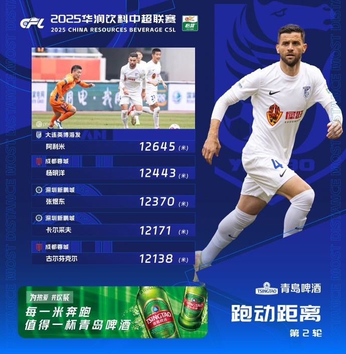 中超第2輪跑動榜:阿利米12645米居首,蓉城、新鵬城各兩人上榜