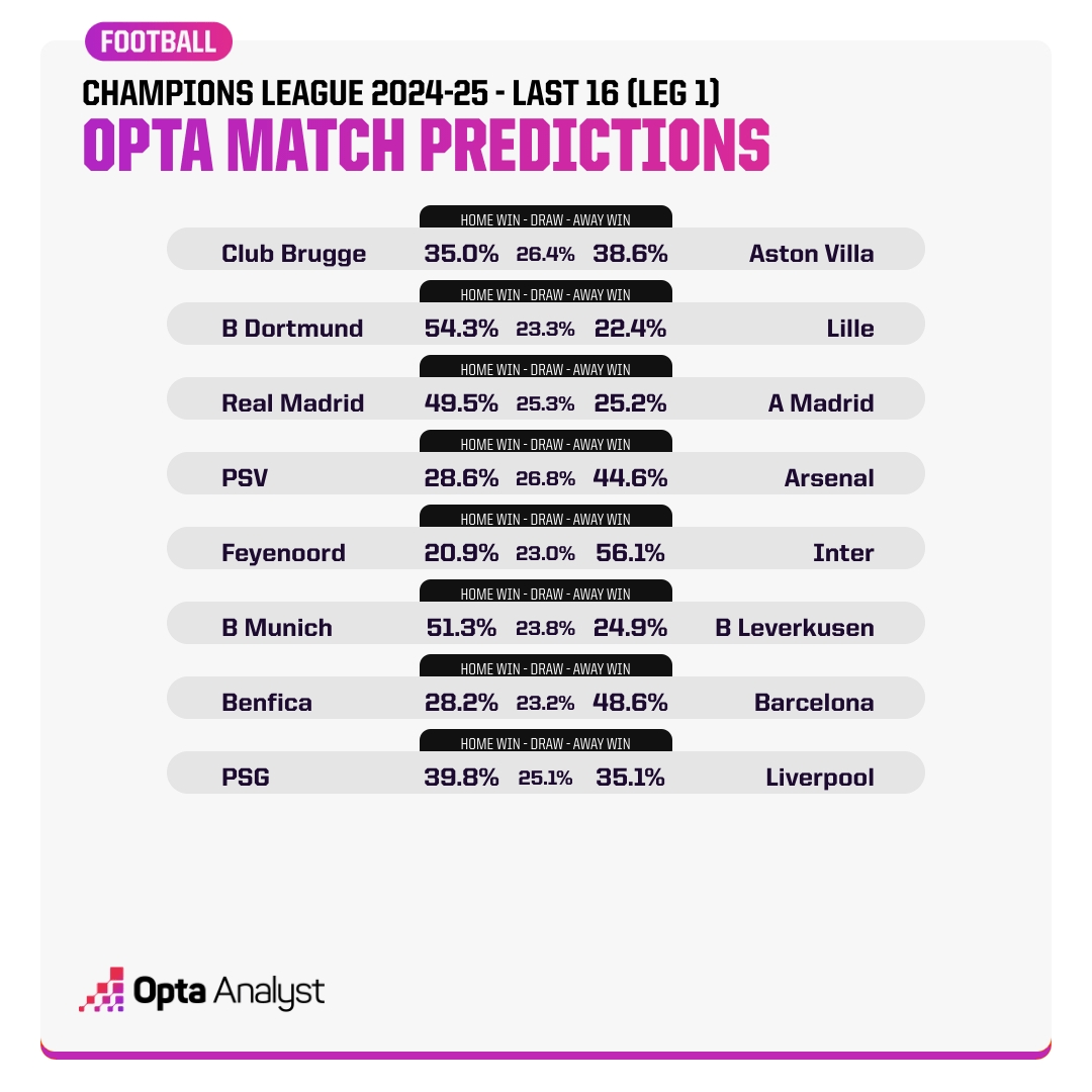 03月04日訊 數據機構Opta對歐冠16強賽首回合的比賽進行了勝負預測,8場對陣中,多特、皇馬、阿森納、國米、拜仁和巴薩最被看好首回合取勝。Opta預測歐冠16強賽首回合勝率:布魯日(35%)vs維