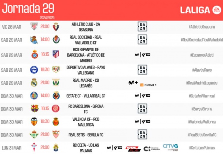 3月4日訊 西甲官網剛剛公布了第29輪開球時間,其中皇馬主場迎戰萊加內斯的比賽將于北京時間3月30日凌晨4點進行,馬競對陣西班牙人、巴薩對陣赫羅納的比賽則分別將于3月29日、30日晚上舉行。西甲第29
