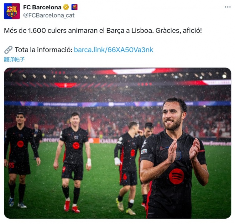 巴薩官方:超過1600名巴薩球迷將在里斯本為球隊加油,感謝球迷們