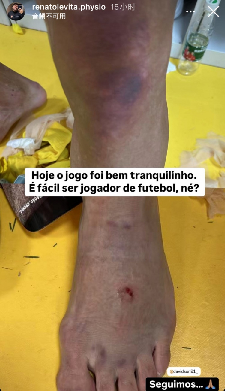 3月4日訊 中超第二輪青島西海岸2-0擊敗武漢三鎮的比賽結束后,西海岸理療師在社媒曬出了戴維森腿部的照片。本場比賽戴維森打滿全場,作為西海岸核心球員的他,自然也得到了三鎮隊的重點“關照”。從西海岸理療
