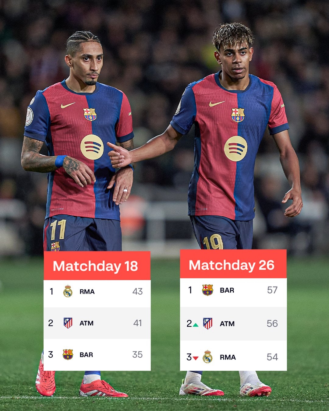 03月03日訊 西甲第26輪,巴塞羅那4-0大勝皇家社會。ESPN曬照,西甲第18輪后,當時皇馬43分第一、馬競41分第二、巴薩35分第三。西甲第26輪后,巴薩57分第一,馬競56分第二,皇馬54分第