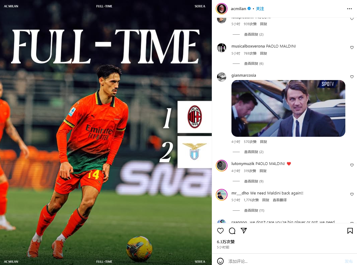 03月03日訊 意甲第27輪,米蘭主場1-2不敵拉齊奧,歐冠出局后遭遇聯賽三連敗,跌至意甲第9。賽后米蘭官方INS評論區,不少球迷呼吁馬爾蒂尼回歸:——41分足夠保級嗎?——所有人都滾,沒有一個人配穿