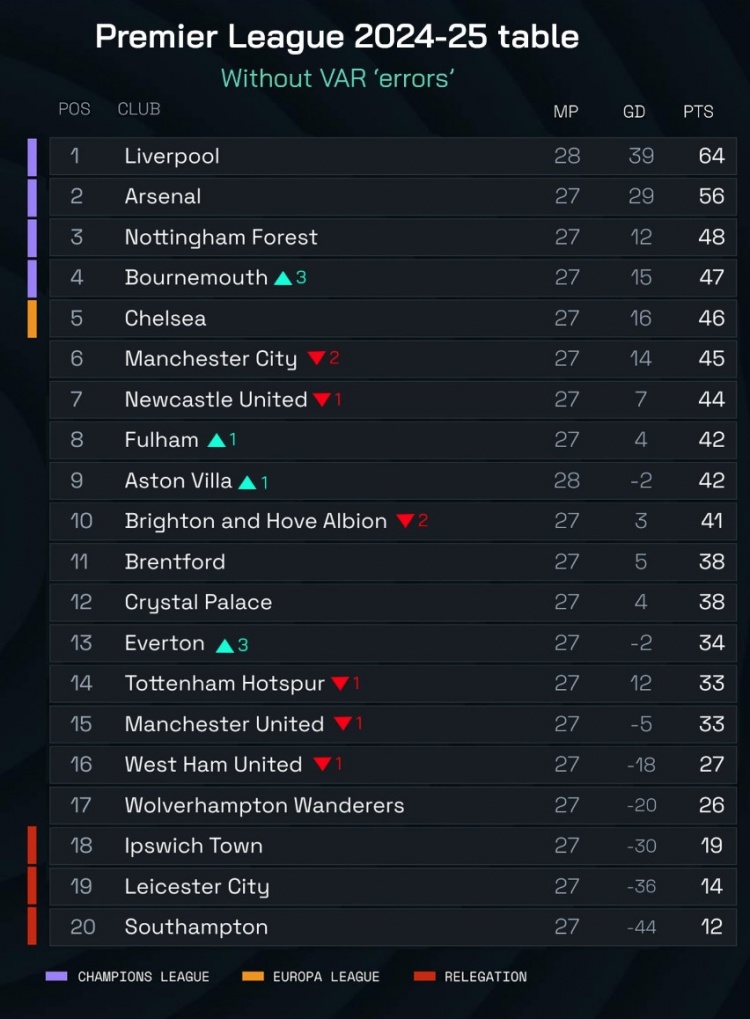 3月2日訊 本賽季英超VAR判罰多次引發(fā)爭議,數(shù)據(jù)機構squakwa則列出了如果沒有VAR“犯錯”的英超本賽季積分榜情況。若無VAR“犯錯”英超積分榜:1.利物浦,64分2.阿森納,56分3.諾丁漢森