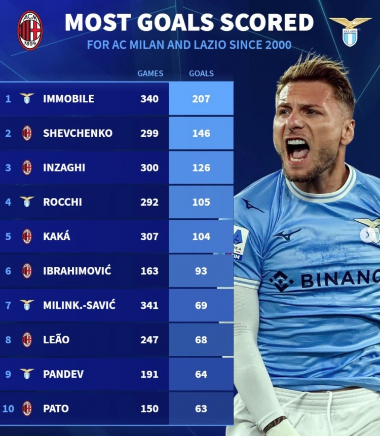 德轉列米蘭&拉齊奧新世紀射手榜:因莫比萊居首,舍瓦、伊布在列