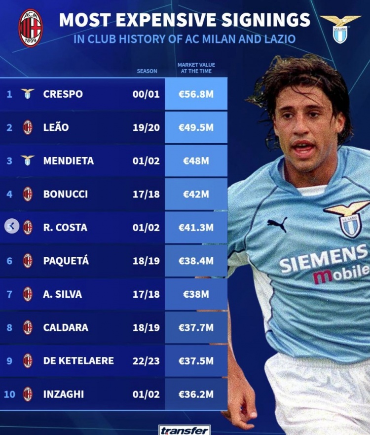 萊奧4950萬是米蘭隊史標王,拉齊奧世紀初超1億砸克雷斯波+門迭塔