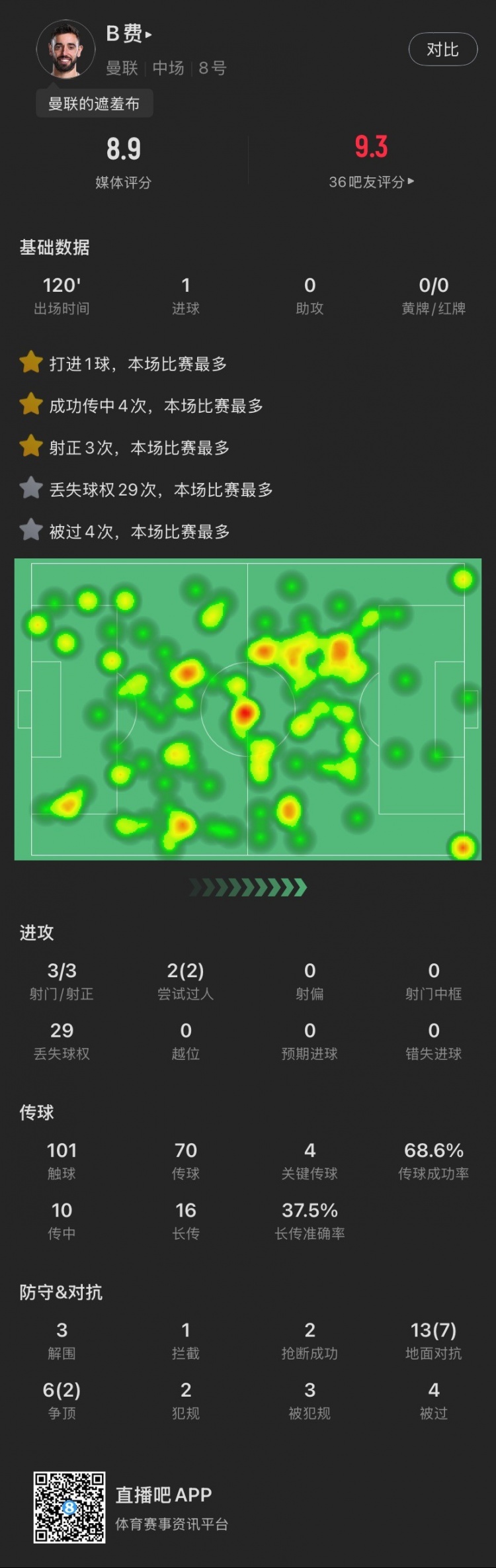 這是毒瘤?B費3射正+4造機會+48成功傳球+10奪回球權均隊內最多