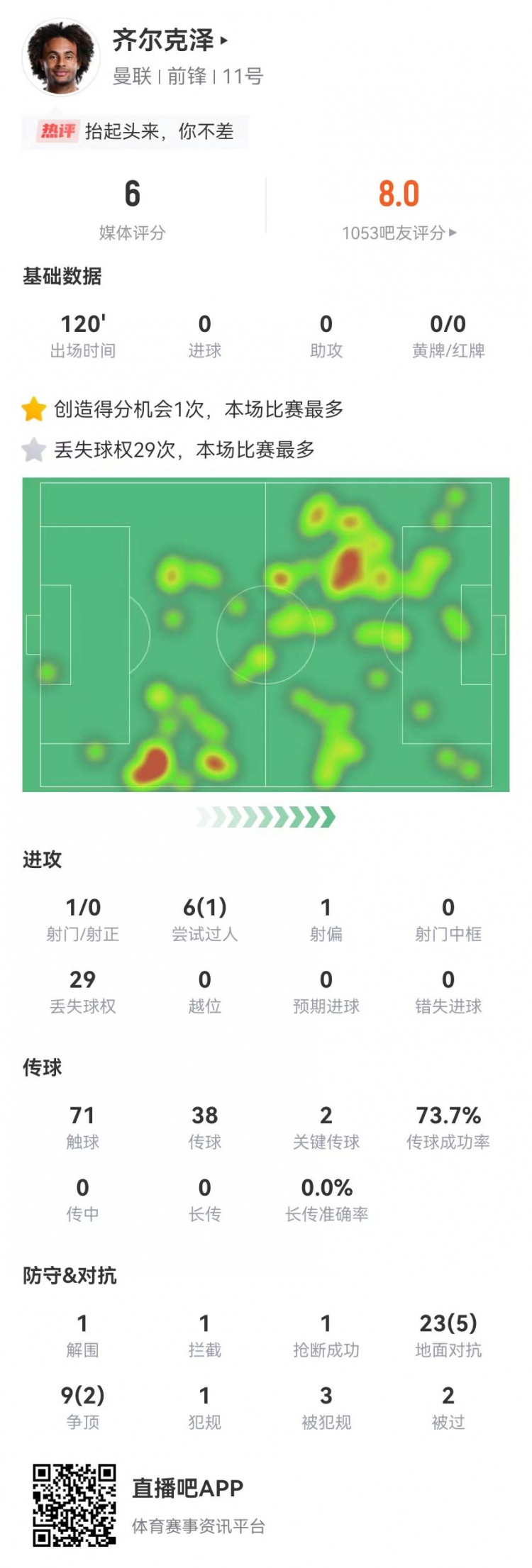齊爾克澤本場點射罰失 6過人1成功 34對抗7成功 29丟失球權