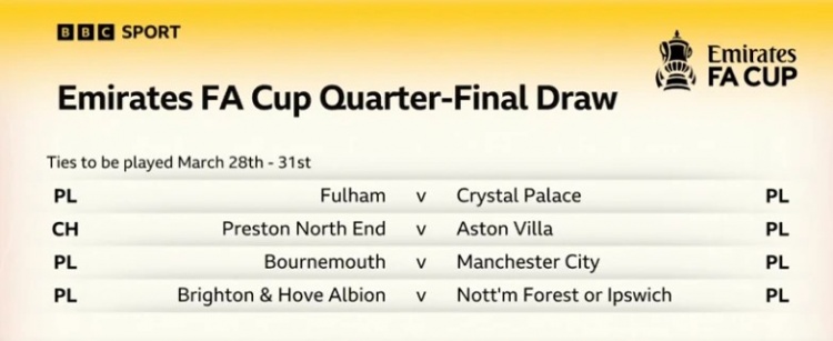 足總杯八強對陣:曼城客戰(zhàn)伯恩茅斯,維拉客戰(zhàn)普雷斯頓