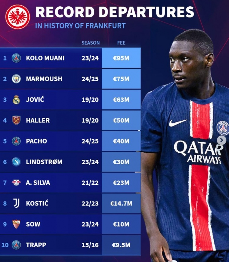 3月2日訊 《轉會市場》統計了法蘭克福隊史賣人最貴榜,穆阿尼以9500萬歐元居首。德轉列法蘭克福隊史賣人榜:歐元1.穆阿尼,→巴黎,23-24賽季,9500萬2.馬爾穆什,→曼城,24-25賽季,75