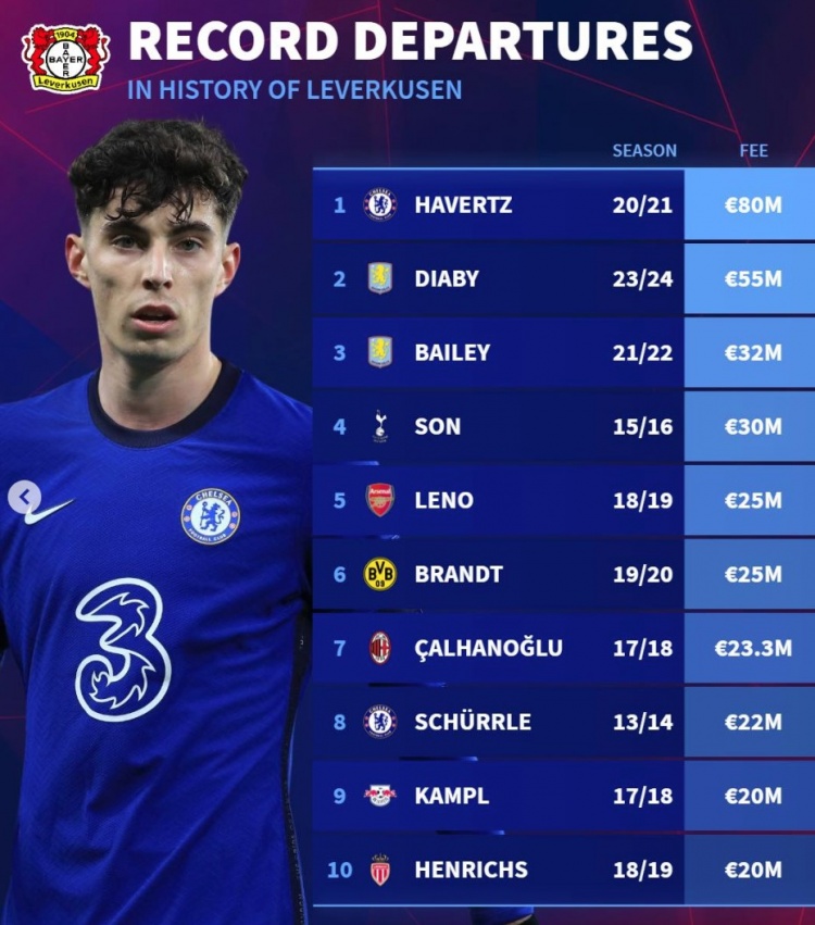 3月2日訊 《轉會市場》統計了勒沃庫森隊史賣人最貴榜,哈弗茨以8000萬歐元居首。德轉列勒沃庫森隊史賣人榜:歐元1.哈弗茨,→切爾西,20-21賽季,8000萬2.穆薩-迪亞比,→維拉,23-24賽季