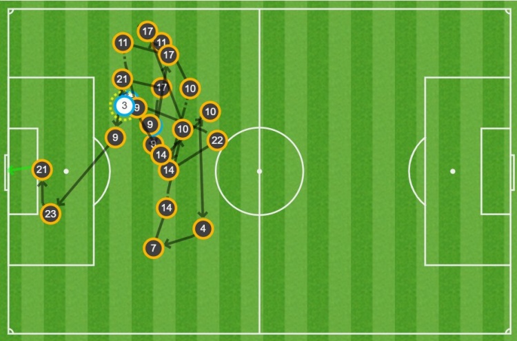 迪亞斯的進球經過了19次傳遞后打進,是皇馬本賽季聯賽客場最多