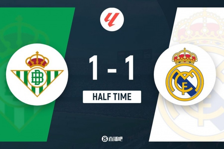 貝蒂斯半場1-1皇馬數據:射門9-3。射正2-1,控球率43%-57%
