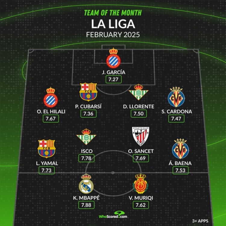 whoscored西甲2月最佳陣:姆巴佩、亞馬爾領銜,伊斯科在列