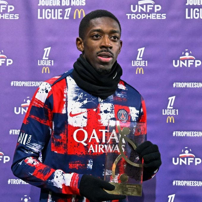 3月2日訊 在巴黎4-1戰勝里爾賽前,登貝萊領取了1月份的法甲最佳球員獎杯。在投票中,登貝萊獲得了39%的選票,這是他自2016年3月后第二次獲得這一獎項。登貝萊也是繼去年9月的巴爾科拉后,本賽季第2