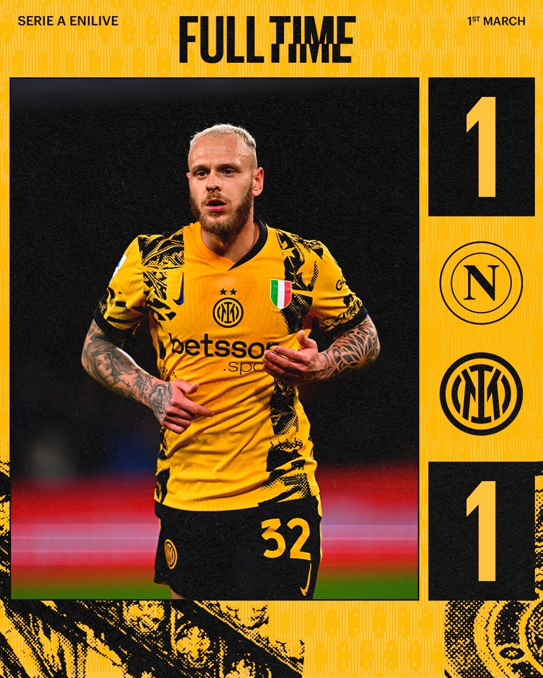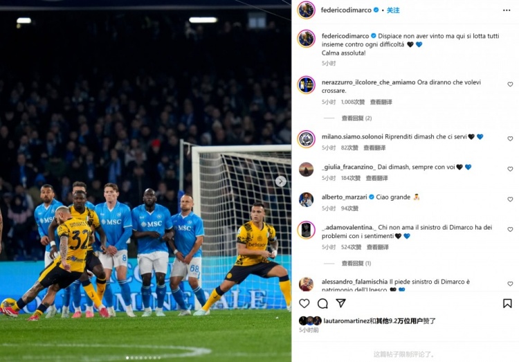 3月2日訊 在本輪意甲爭冠天王山之戰,國米1-1戰平那不勒斯。本場比賽迪馬爾科上半場打進精彩任意球,賽后他也在個人社媒曬出破門瞬間照片,配文寫道:“很遺憾未能取得勝利,但是面對勁敵我們全隊都在團結拼搏