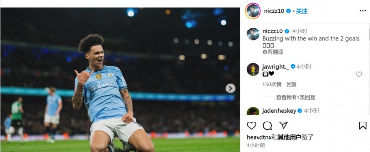 3月2日訊 足總杯1/8決賽,曼城3-1普利茅斯。賽后,本場比賽打進2球的奧賴利更新了自己的ins。奧賴利在ins上寫道:“為勝利和2粒進球感到興奮。”賽后曼城官方宣布,奧賴利當選本場比賽隊內最佳球員