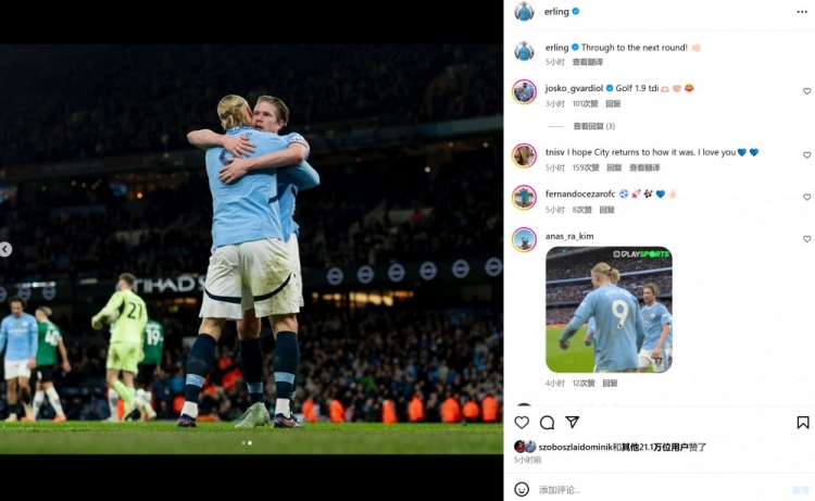3月2日訊 在本輪足總杯,曼城3-1擊敗普利茅斯。本場比賽哈蘭德助攻德布勞內破門,賽后哈蘭德也在個人社媒曬出與德布勞內相擁慶祝的照片,配文寫道:“晉級足總杯 下一輪!”
