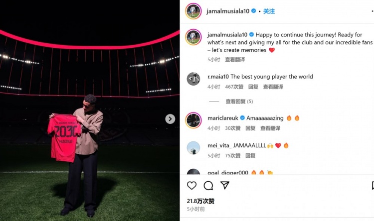 穆西亞拉社媒曬手持球衣照紀念續(xù)約:很高興能夠繼續(xù)這段旅程