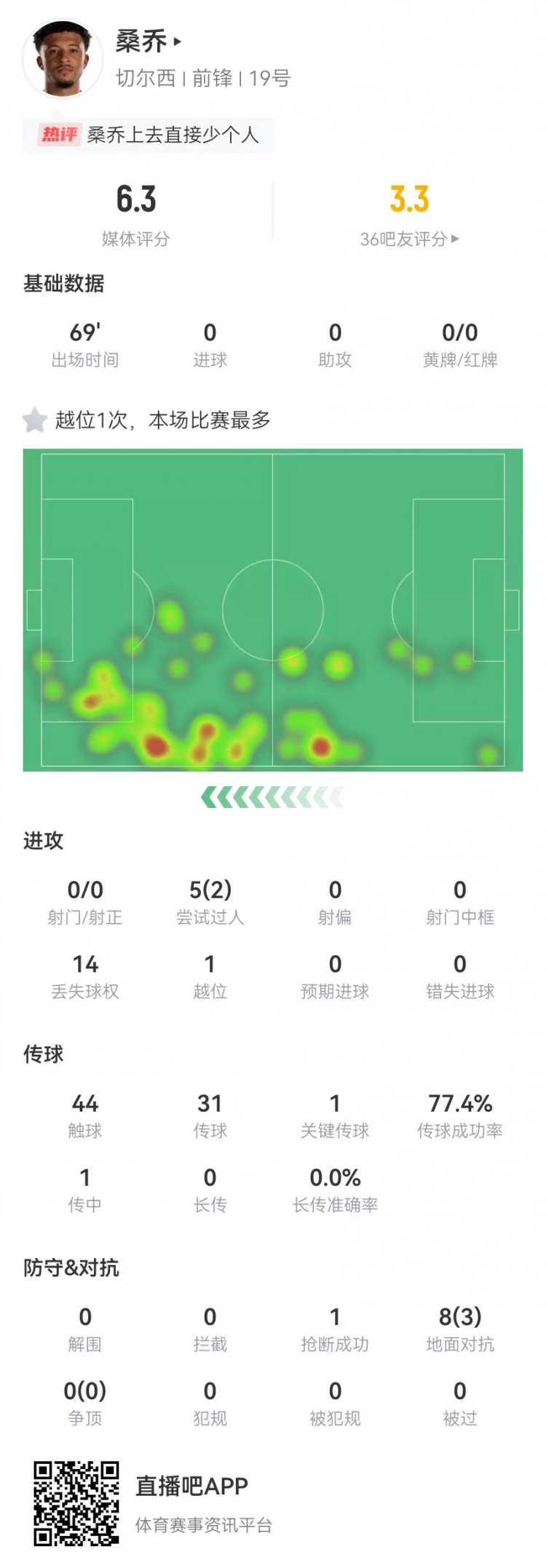 尋人啟事!桑喬替補69分鐘:5過人2成功 8對抗3成功 僅獲6.3分