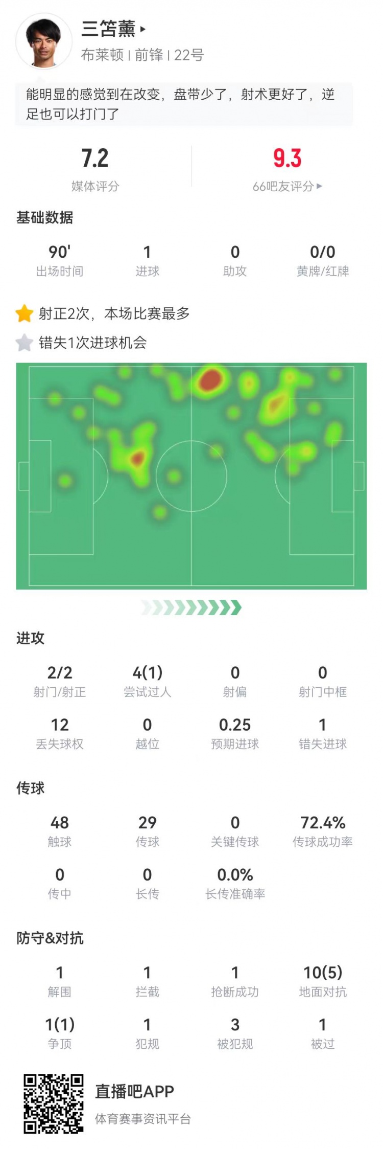 三笘薰本場2射2正進1球+1失良機 4過人1成功 11對抗6成功+3造犯規(guī)