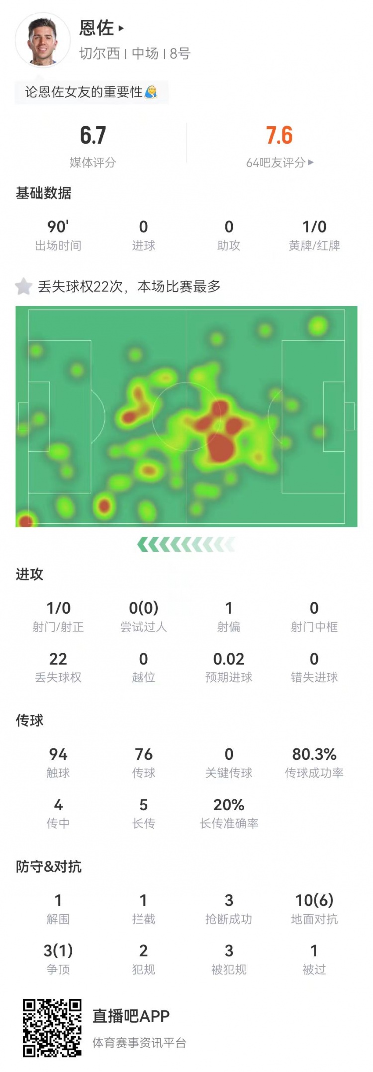 恩佐本場4傳中0成功 5長傳1成功 13對抗7成功 2犯規(guī)3造犯規(guī)3搶斷