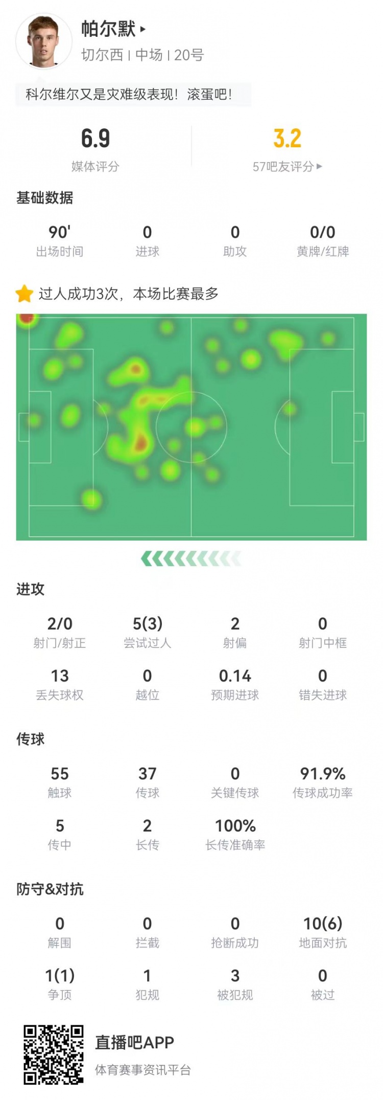 帕爾默本場2射0正+0關(guān)鍵傳球 5傳中0成功 11對抗7成功+3造犯規(guī)