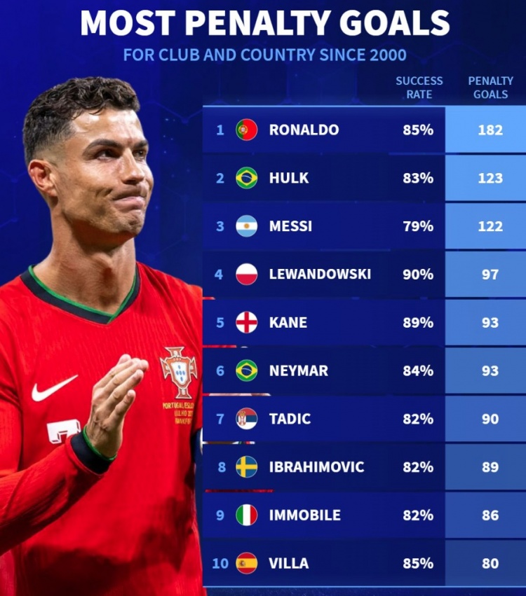德轉(zhuǎn)新世紀點球榜:C羅182球、梅西122球,萊萬&凱恩&內(nèi)馬爾在列