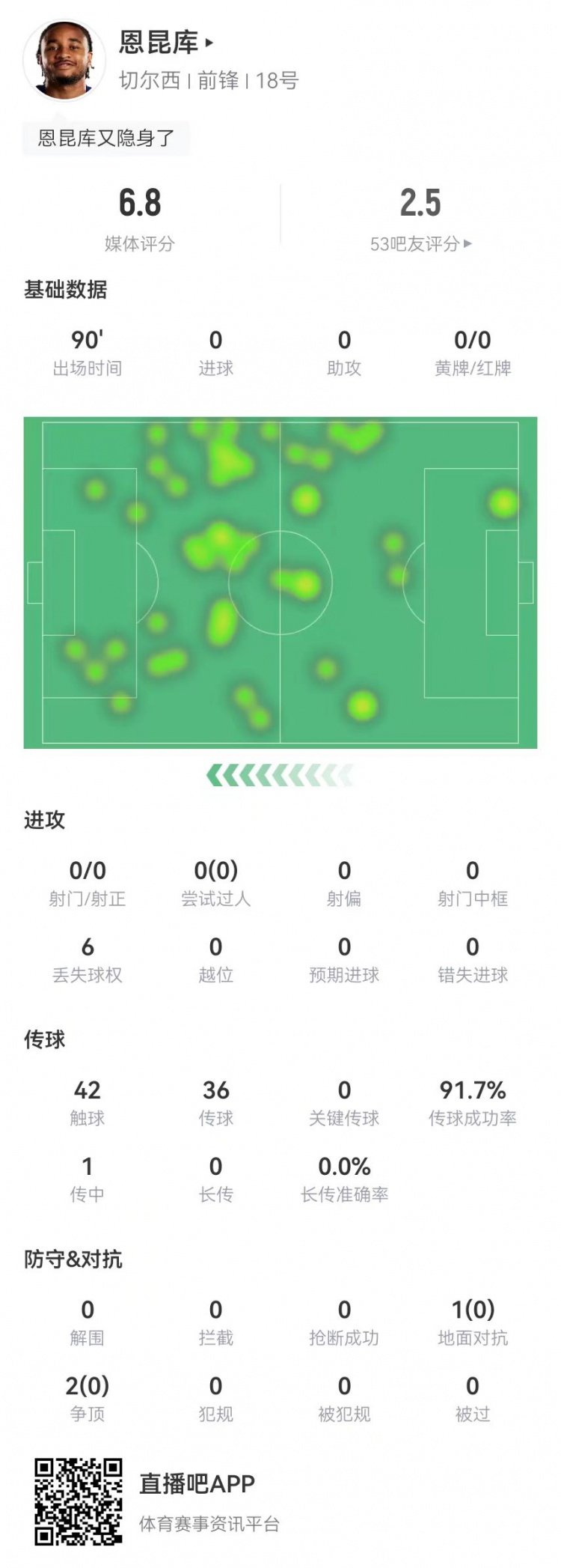 踢得了中鋒嗎?!恩昆庫本場0射門0關(guān)鍵傳球0過人 3對抗0成功