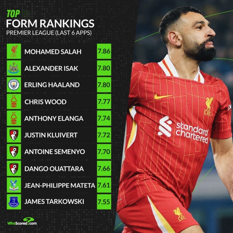 whoscored英超狀態(tài)榜:薩拉赫重回榜首,伊薩克&哈蘭德&伍德在列