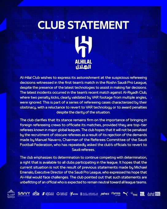 利雅得新月聲明:抗議裁判的固執(zhí)判罰,要求引進外國頂級裁判執(zhí)法