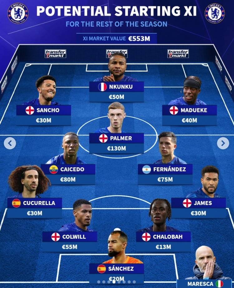 2月15日訊 《轉(zhuǎn)會市場》預測了切爾西本賽季剩余賽程首發(fā)陣容,恩昆庫客串中鋒。德轉(zhuǎn)預測切爾西下半程首發(fā)陣:總身價5.53億歐元前鋒:桑喬(3000萬)、恩昆庫(5000萬)、馬杜埃凱(4000萬)中場