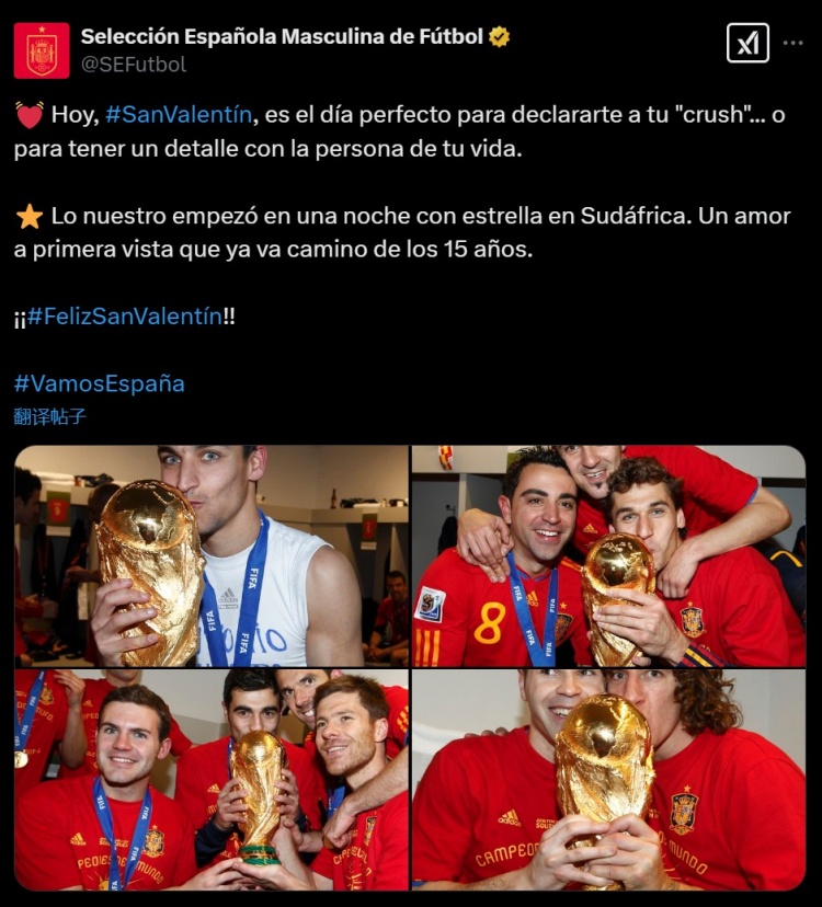 2月15日訊 當?shù)貢r間2月14日是西方情人節(jié),西班牙隊官推也借此回顧了15年前贏得南非世界杯的榮耀。西班牙隊官推曬出了球隊贏得2010年世界杯后的照片,并配文:“今天是情人節(jié),是向你暗戀的人表白愛情的