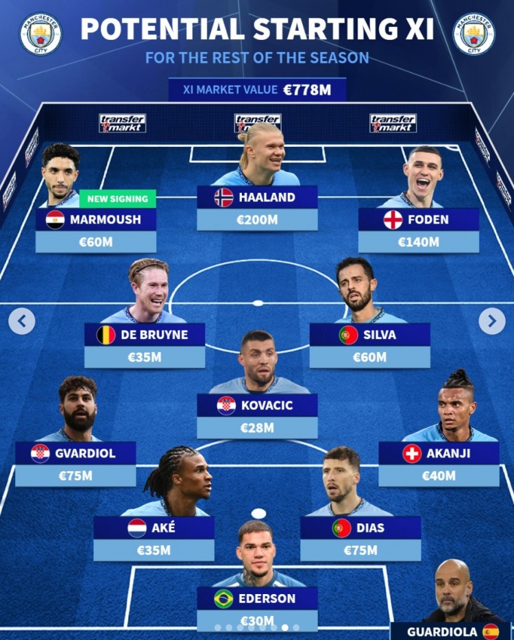 2月15日訊 曼城在今年冬窗引進4名新援,《轉(zhuǎn)會市場》也預測了他們在下半程賽季的首發(fā)陣容情況。德轉(zhuǎn)預測曼城下半程首發(fā)陣:總身價7.78億歐元前鋒:馬爾穆什(6000萬)、哈蘭德(2億)、福登(1.4億