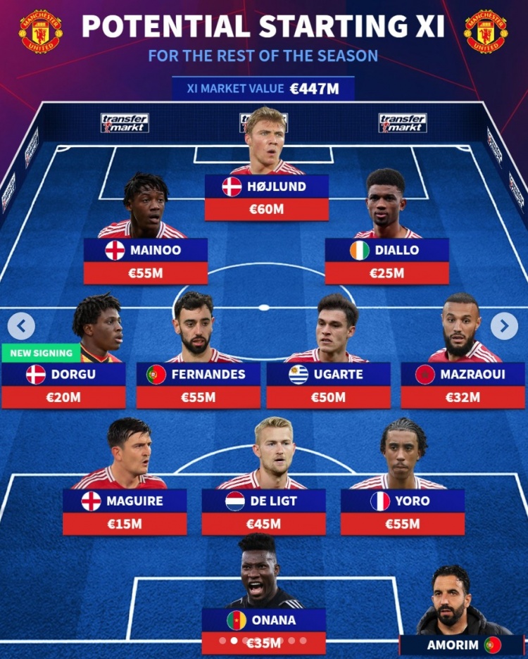 2月15日訊 上半程表現(xiàn)低迷的曼聯(lián)冬窗并未進行太多補強,《轉(zhuǎn)會市場》也預測了曼聯(lián)下半程的首發(fā)陣容情況。德轉(zhuǎn)預測曼聯(lián)下半程首發(fā)陣:總身價4.47億歐元中鋒:霍伊倫(6000萬)前腰:梅努(5500萬)、