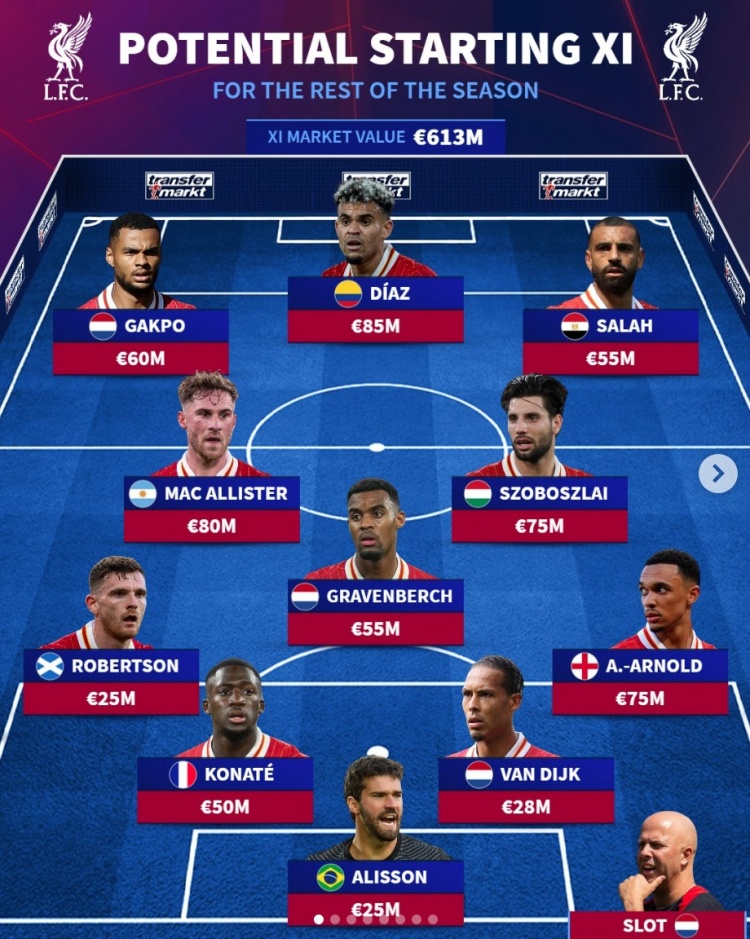 2月15日訊 利物浦并未在冬窗進行引援,《轉(zhuǎn)會市場》預測了紅軍下半程首發(fā)陣容,預計不會有變化。德轉(zhuǎn)預測利物浦下半程首發(fā)陣:總身價6.13億歐元前鋒:加克波(6000萬)、路易斯-迪亞斯(8500萬)、