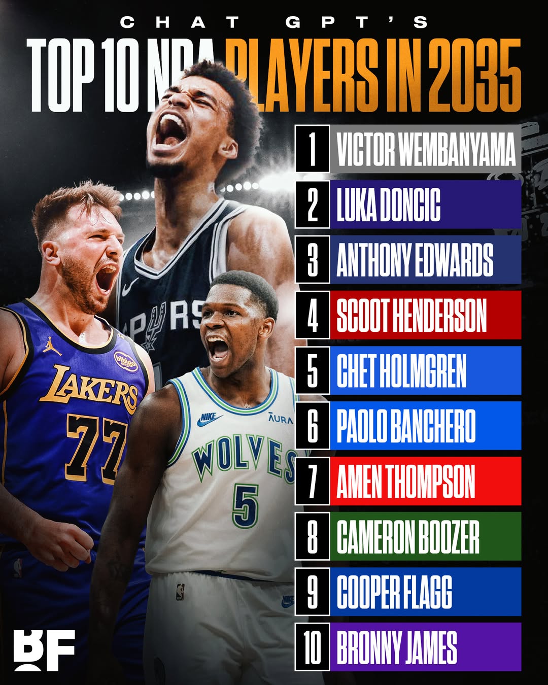 ChatGpt預(yù)測(cè)十年后前十球員:文班第一 東契奇第二 布朗尼第10