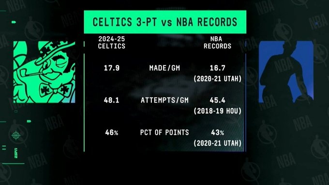 3月9日訊 NBA常規賽,凱爾特人主場迎戰湖人。轉播方曬出一組本賽季凱爾特人和NBA歷史三分數據的對比:場均三分命中數:紀錄是16.7個(2020-21賽季爵士),綠軍17.9個場均三分出手數:紀錄是