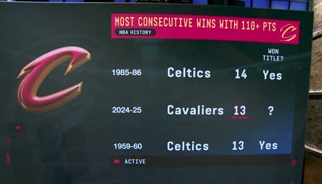 騎士成歷史第3支至少13連勝且得分皆110+球隊 此前綠軍2次都奪冠