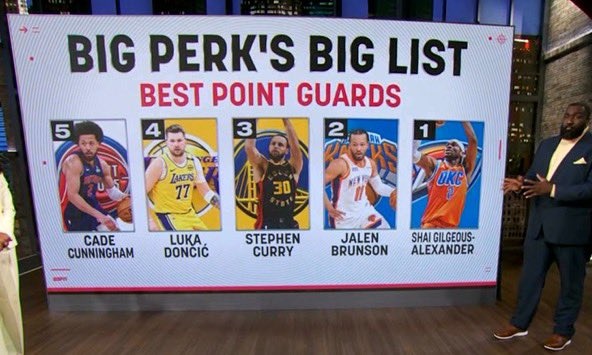帕金斯列聯盟目前前5控衛:SGA、布倫森、庫里、東契奇、CC