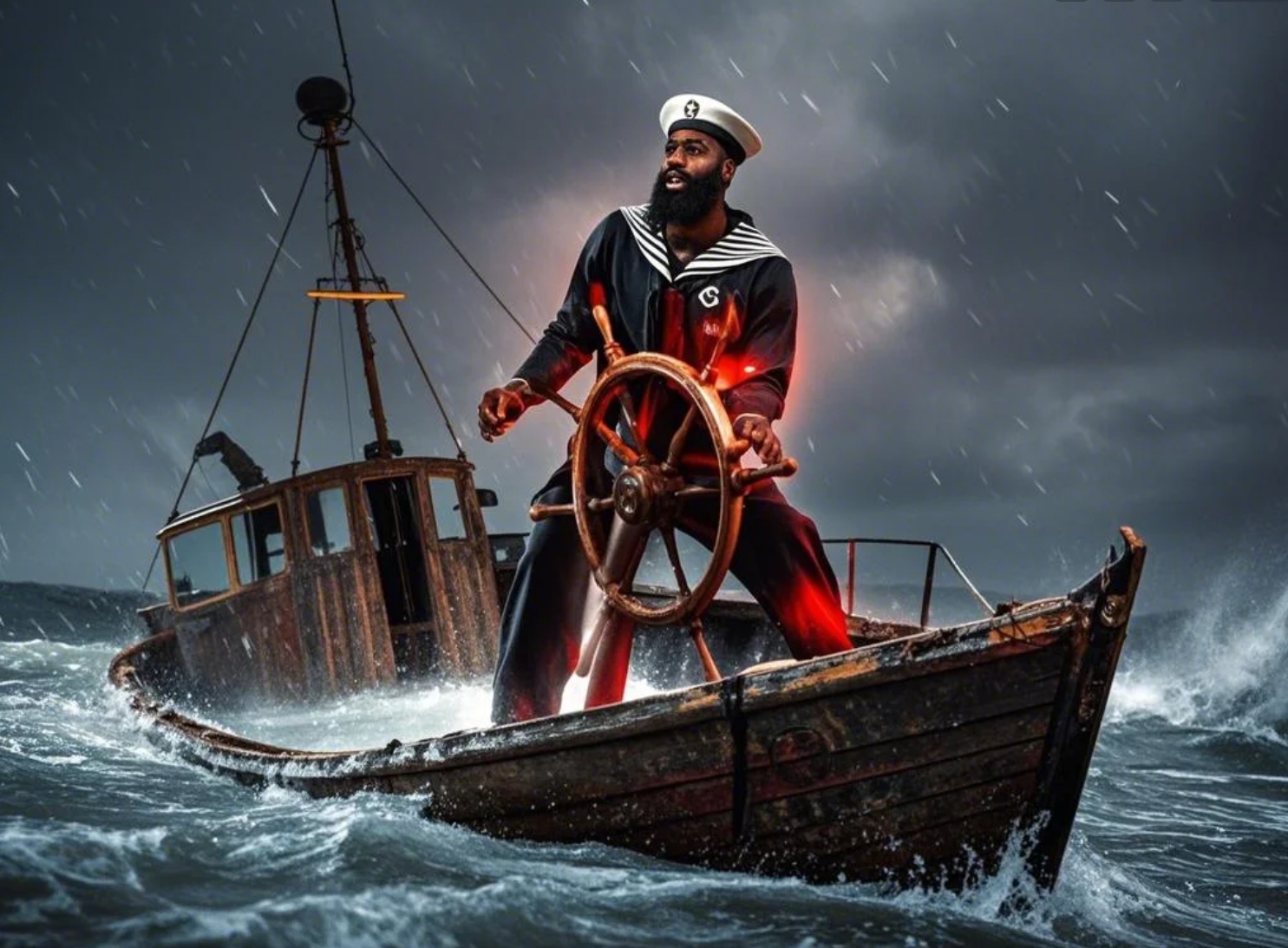 【AI繪圖】大胡子船長率風雨飄搖中即將沉沒的小破船重回正軌~