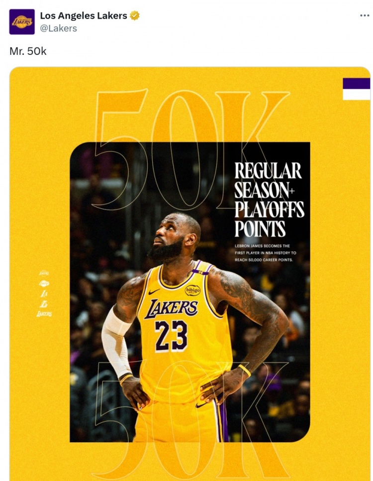 3月5日訊 今日湖人vs鵜鶘,詹姆斯拿下3分后生涯常規賽+季后賽總得分突破了50000分。湖人官方曬出海報寫道:“50000分先生。”