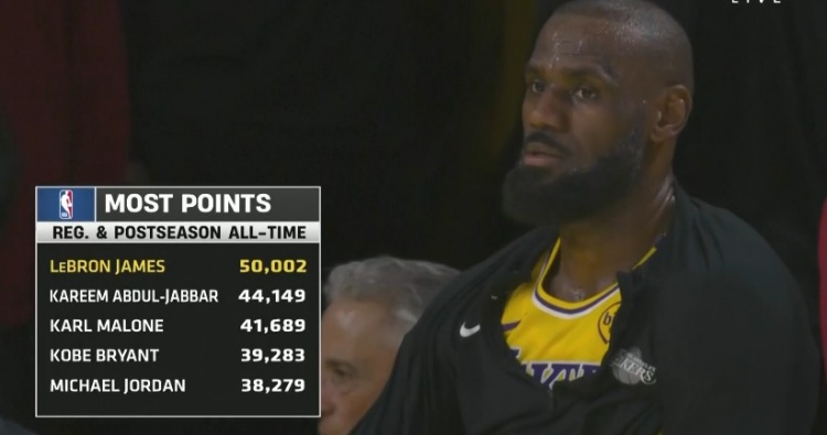 3月5日訊 NBA常規賽,湖人和鵜鶘的比賽正在進行。截至發稿前,湖人球星詹姆斯已拿到3分,總得分來到50002分,繼續高居聯盟歷史第一。賈巴爾44149分排在第二,卡爾-馬龍41689分排在第三,科比